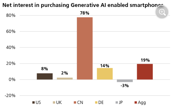 尽管对具备生成式AI功能的智能手机的兴趣从去年四季度的16%微升至19%,但这远不足以形成所谓的“超级周期”。