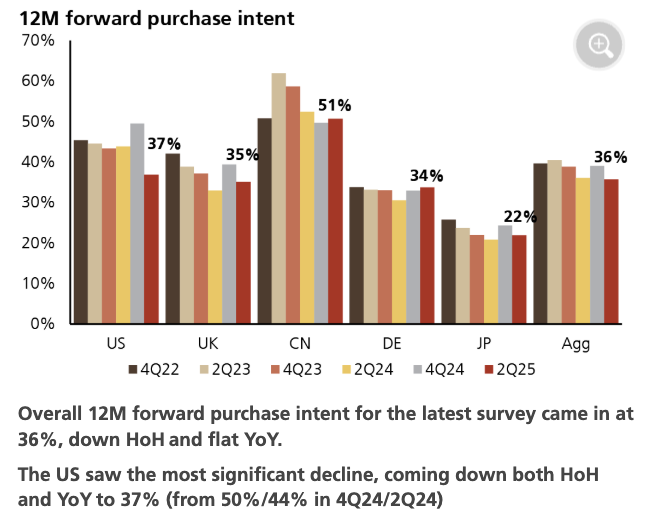 瑞银报告指出,未来12个月的智能手机购买意向已从去年四季度的39%下滑至36%。美国市场的崩塌式下滑尤为引人注目,其远期购买意向从四季度惊人的50%暴跌至37%,同比也低于去年的44%。