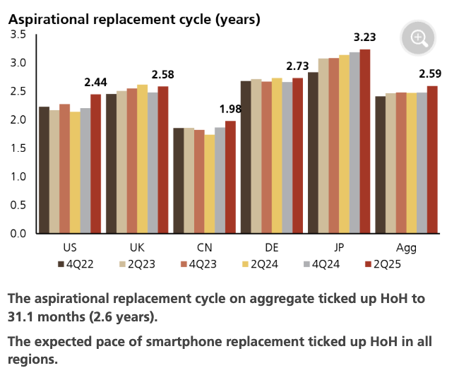 被称为“期望更换周期”的数据——即消费者计划持有多久才更换新手机——已经从去年四季度的29.7个月,悄然延长至31.1个月(约2.59年)。